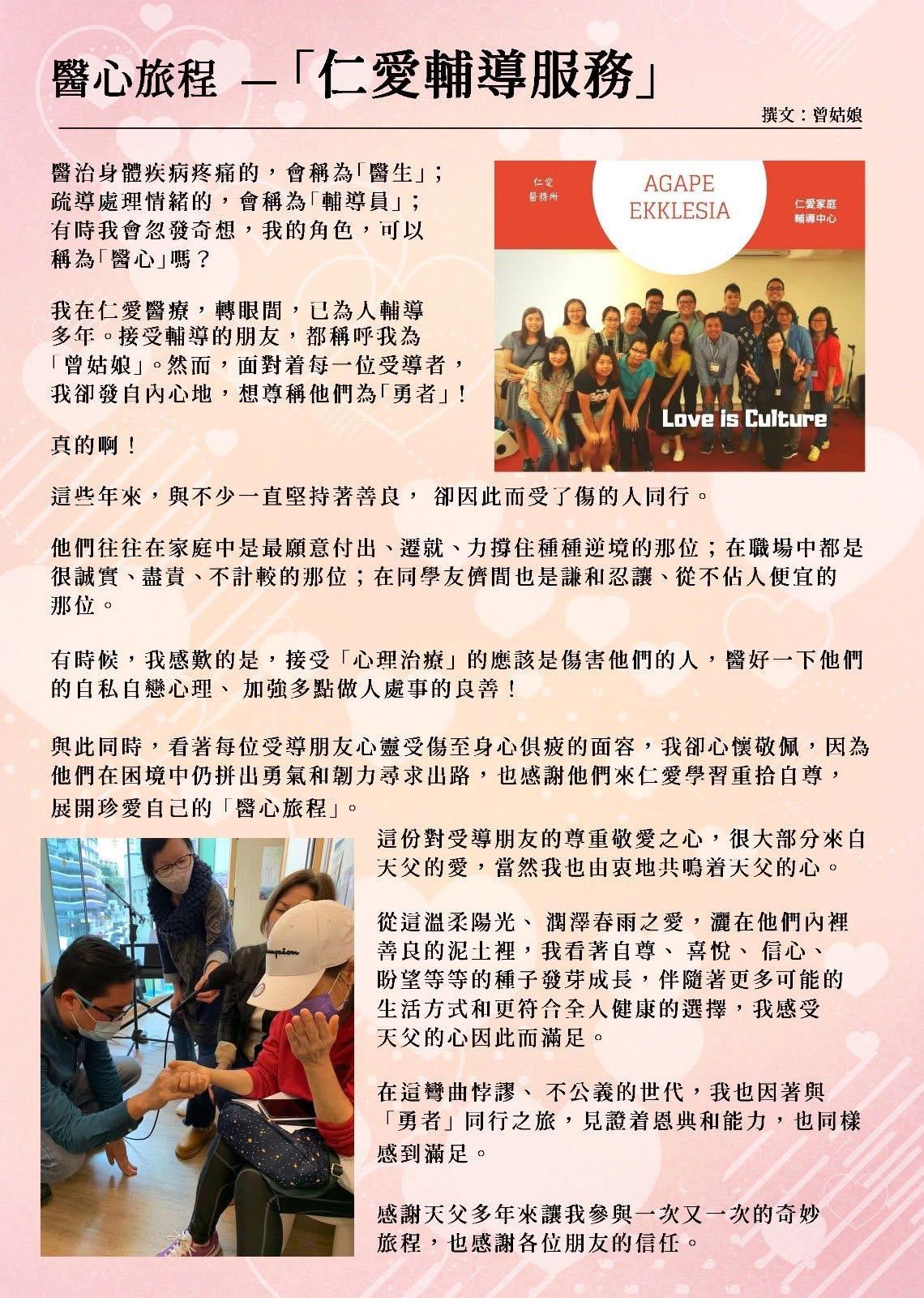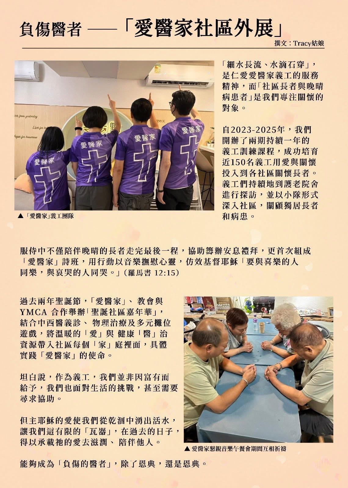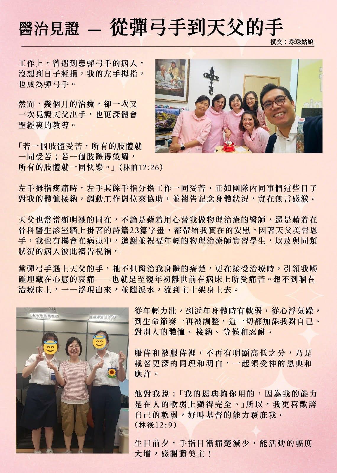 醫療媒體服侍Healthcare Testimony Media 一杯涼水:北區醫院的鋼琴服侍 《風聆心語》 2026年 仁愛家庭醫務所 第一季季刊 二十週年紀念創刊號 負傷的醫者 CDN 盼望透過媒體傳揚上帝在醫療界的許多奇妙作為,2020年舆視博恩星火飛騰系列合作拍攝七集「負傷的醫者」見證集,2021年開始協助瑪麗醫院院牧部每月崇拜拍攝影片,讓病患者從線上得著上帝話語而來的安慰和鼓勵。 2021年 CDN 開始協助瑪麗醫院院牧部每月崇拜拍攝影片,讓病患者從線上得著上帝話語而來的安慰和鼓勵。
